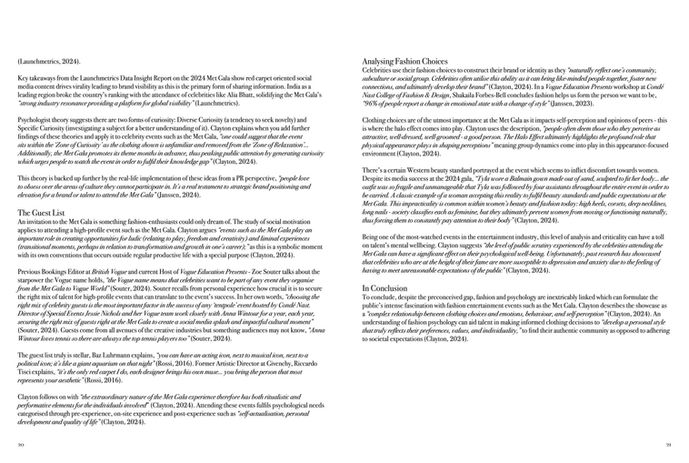 This endeavour links to my personal intended and aspirational career path as I am interested in working in the publication industry, specifically a magazine such as Vogue - the host of the Met Gala. This experience has helped me learn more about the Vogue tone-of-voice in the written word, the psychology of fashion in relation to the event and hear from a number of contributors opinions on the event - among a plethora of other subjects.